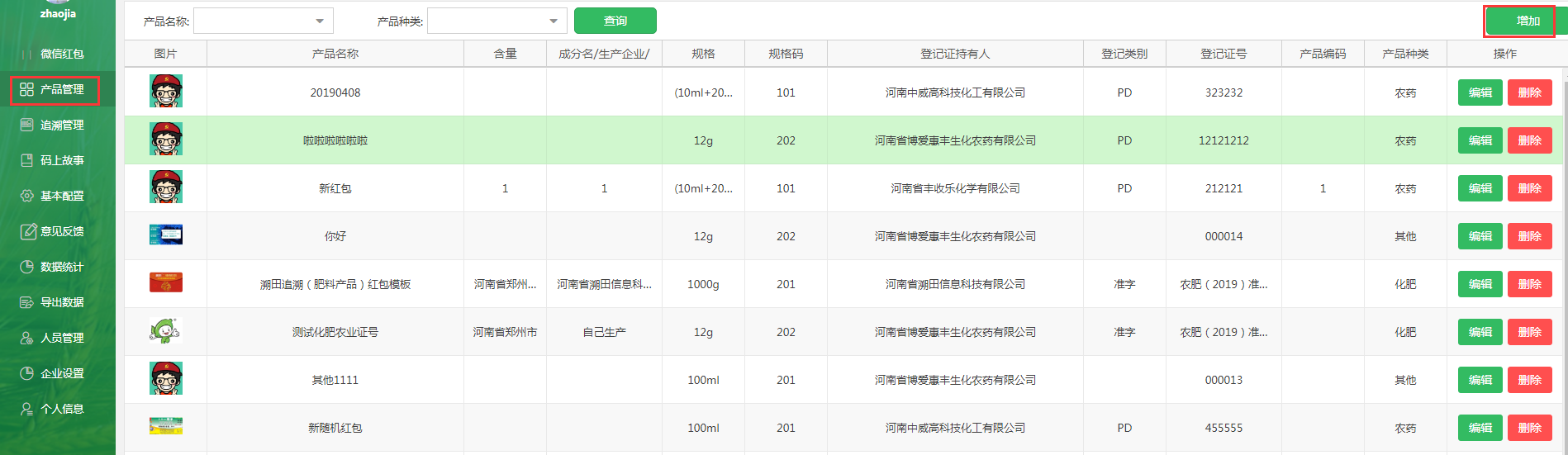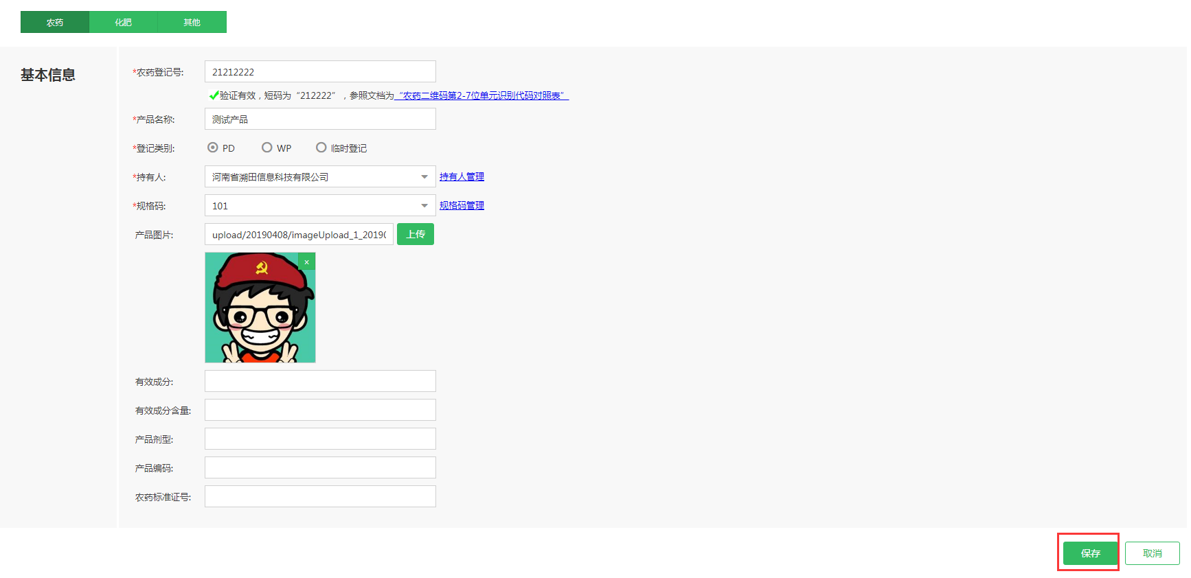 步骤2:在新增产品页面先选择需要添加的产品类型(农药,化肥,其他)之后,在填写对应的产品信息,填写完成之后点击“保存”,提示保存成功之后,就可以在“产品管理”列表里看到刚刚添加的产品啦。